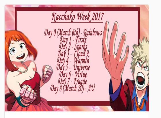 Kacchako Week is a fandom event week focused on the ship Kacchako between Bakugou Katsuki and Uraraka Ochako from Boku no Hero Academia.It is an annual Event Week that has been feeding and uplifting the Kacchako fandom since 2018 where it originated on Tumblr as Kacchako Bittersweet Week.
