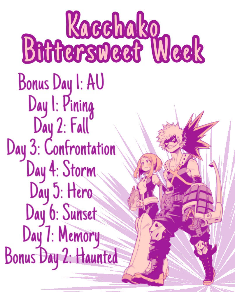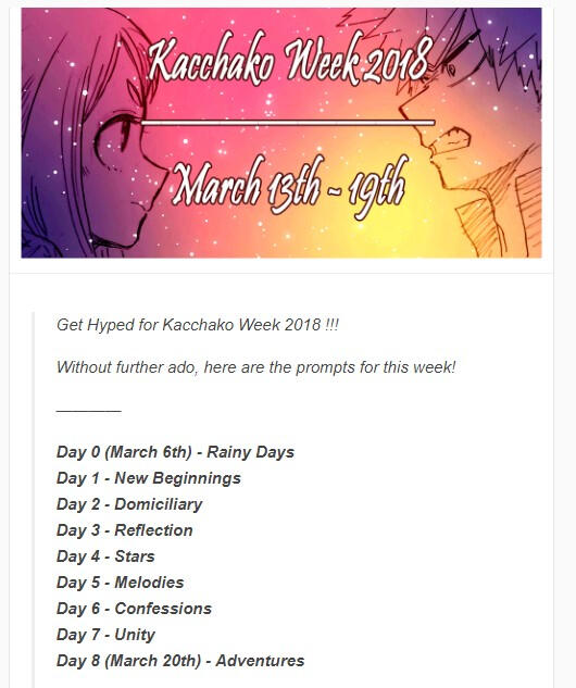 Kacchako Week is an annual Event Week that has been feeding and uplifting the Kacchako fandom since 2018 where it originated on Tumblr as Kacchako Bittersweet Week.You can see previous mods and prompts here.