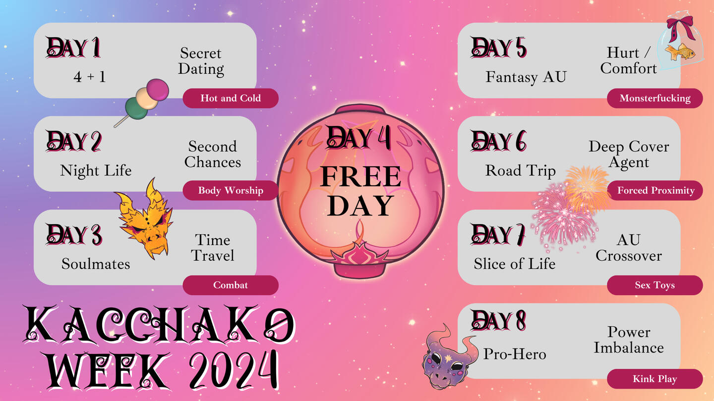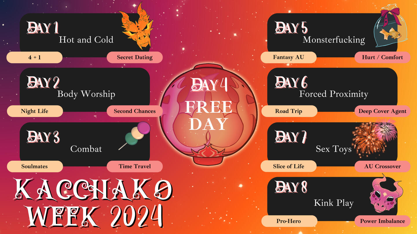 Kacchako Week is eight (8) days from May 24th through May 31st, with the free day falling on Kacchako Day (May 29th).For those 8 days, daily prompts are released and creators are encouraged to share any artistic content they created specifically for or that relates to the prompts.